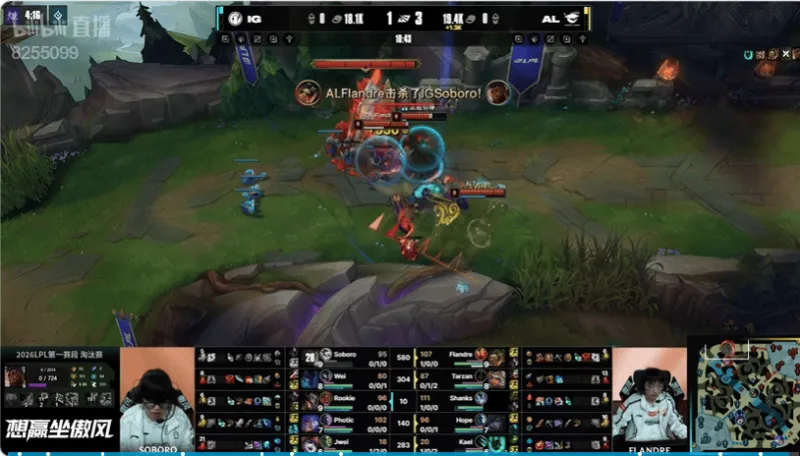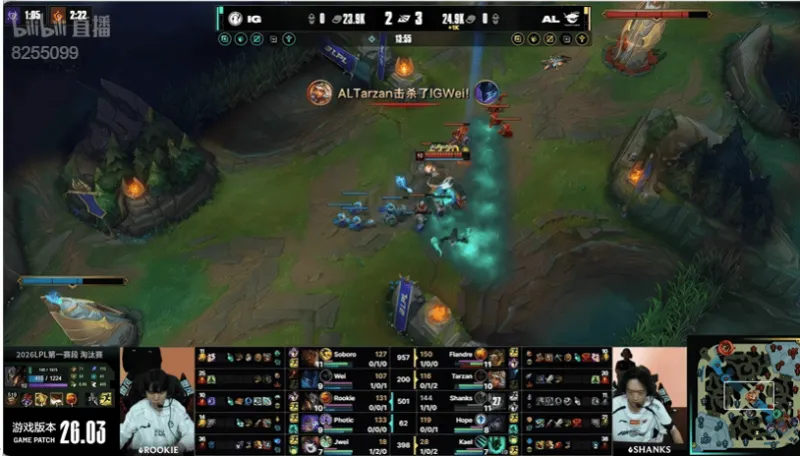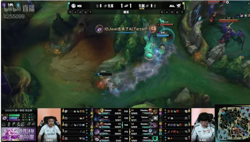 5分钟:锤石先手勾到璐璐配合队友拿下一血