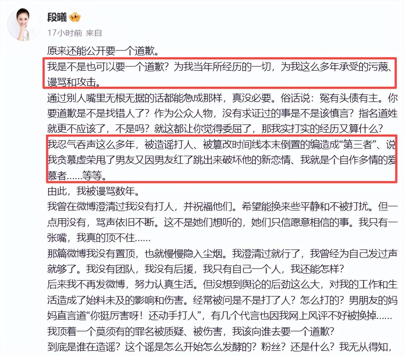 所以,这么来看,段曦在如此时间节点站出来发声,显然是要力挺薛之谦的。