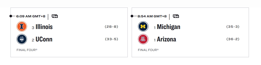 终极四强赛将于北京时间4月5日早上6:09打响。